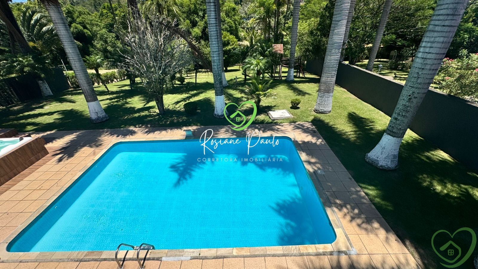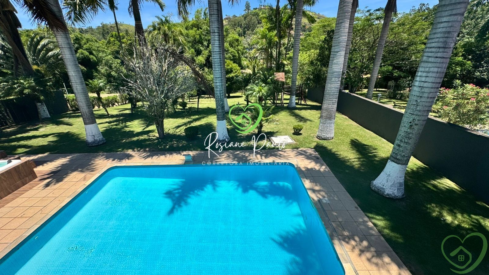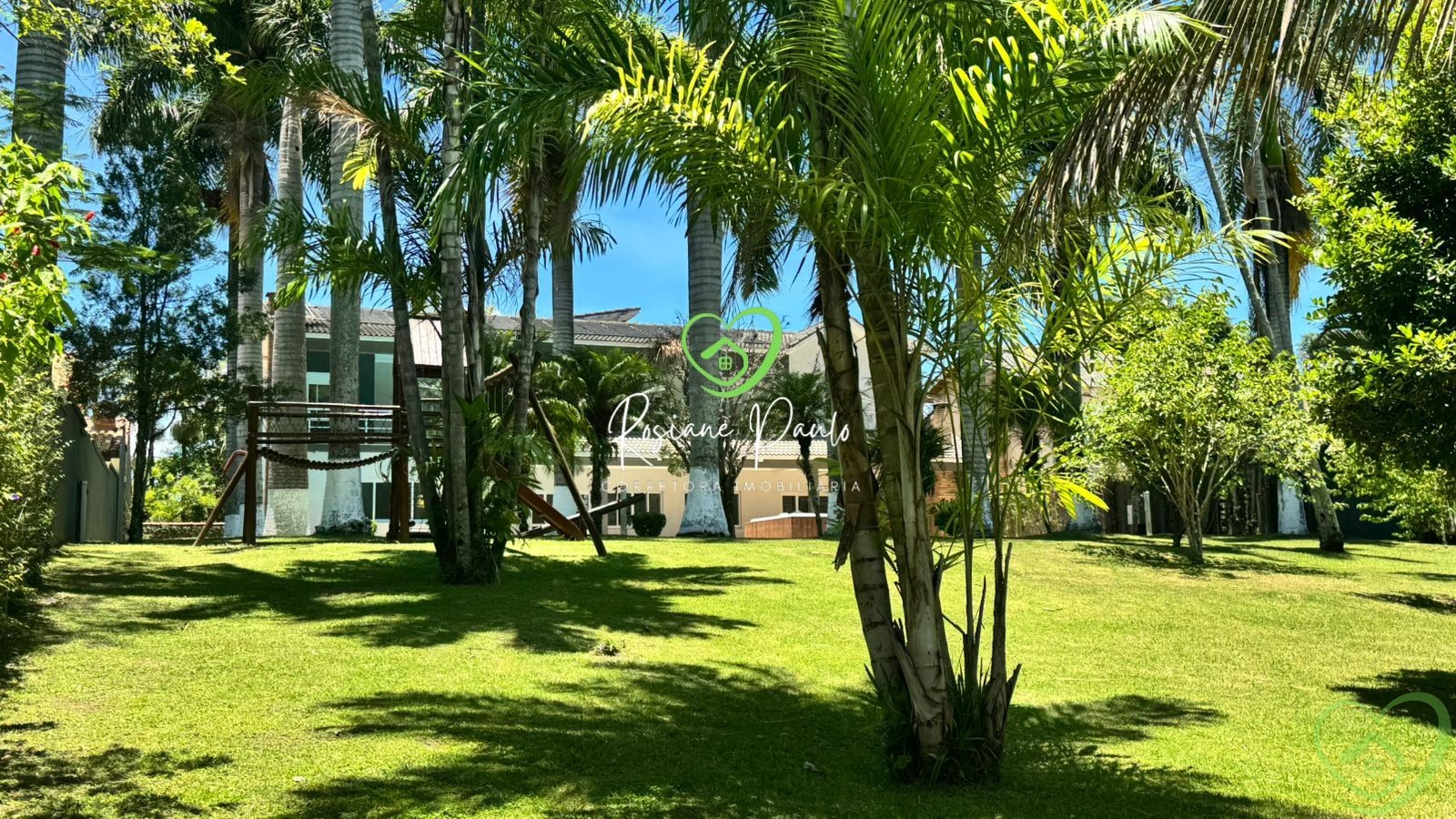 Área externa com playground, amplo gramado e árvores frutíferas